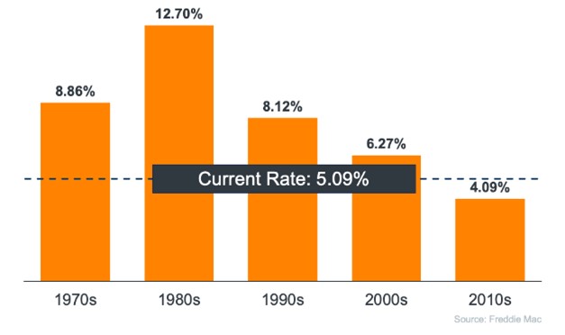 Mortgage rates are up: Rates have been volatile this year. Coming into 2022, 30-year conventional mortgage rates were around 3% – today they’re closer to 6%. That means a buyer borrowing $100,000 for 30 years in January would have paid about $422/month; that same buyer today would pay about $600/month. Most buyers purchase a home based on the monthly payment they are comfortable with, so that has decreased the buyer pool. That said, rates are still historically low (the 30-year rate is higher than what’s noted in the image).