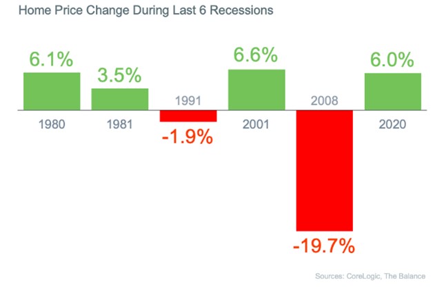 Home values probably won’t drop: For many of us, the Great Recession is still a recent memory, so it’s shaping our perception of what will happen if another recession hits. Of course, that was a housing recession fueled by terrible lending practices with many banks not verifying income or assets (“no-doc” loans). Buyers could borrow 100% of their purchase price on a variable rate loan that didn’t require them to pay the interest that accumulated each month nor reduce their principal – their mortgage balances grew every month! They bought houses they literally couldn’t afford. Now, borrowers must have a down payment, and they must prove they have sufficient income to make their payments. They’re buying houses they can afford. Did you know that home values increased in four of the last six recessions?