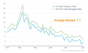 The Federal Reserve recently raised the Fed Funds Rate by 0.75%: Many people have confused that with mortgage rates – while those moves do affect mortgage rates, they’re not tied directly to them. The Fed Funds Rate is a short-term rate that banks charge each other – usually overnight. Home mortgages are usually 30-year loans, bundled together in large quantities and sold to investors as long-term investments called mortgage-backed securities. As such, they’re more closely tied to other long-term investments, like the 10-year Treasury Note. Here’s a chart illustrating that.