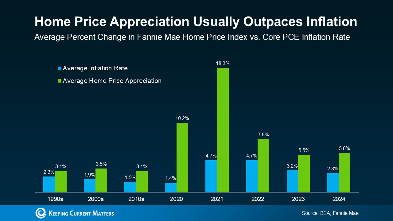 Another big reason homeownership is a great hedge against inflation is that home values tend to appreciate over time — often at a higher rate than inflation, according to data from the BEA and Fannie Mae (see graph below):