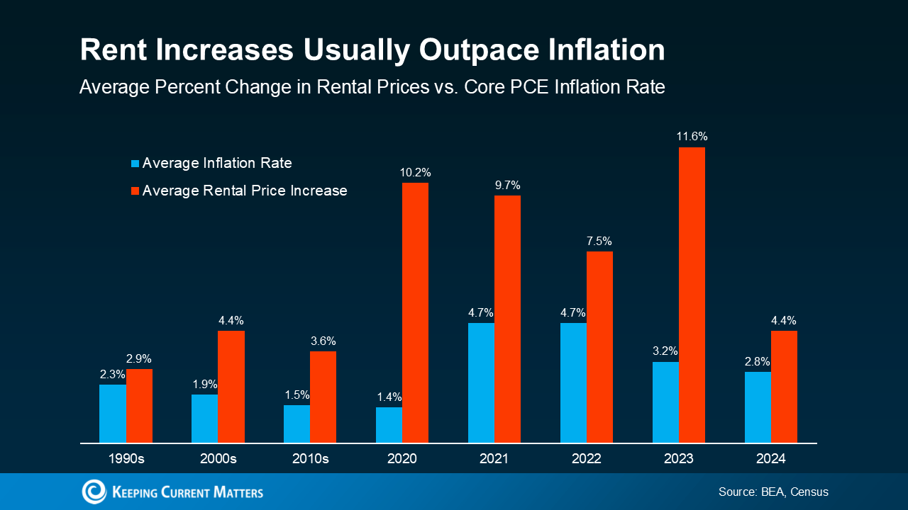 That’s not the case if you rent. Rent tends to rise over time, and it usually goes up even faster than the rate of inflation. Just look at the data from the Bureau of Economic Analysis (BEA) and the Census Bureau (see graph below):