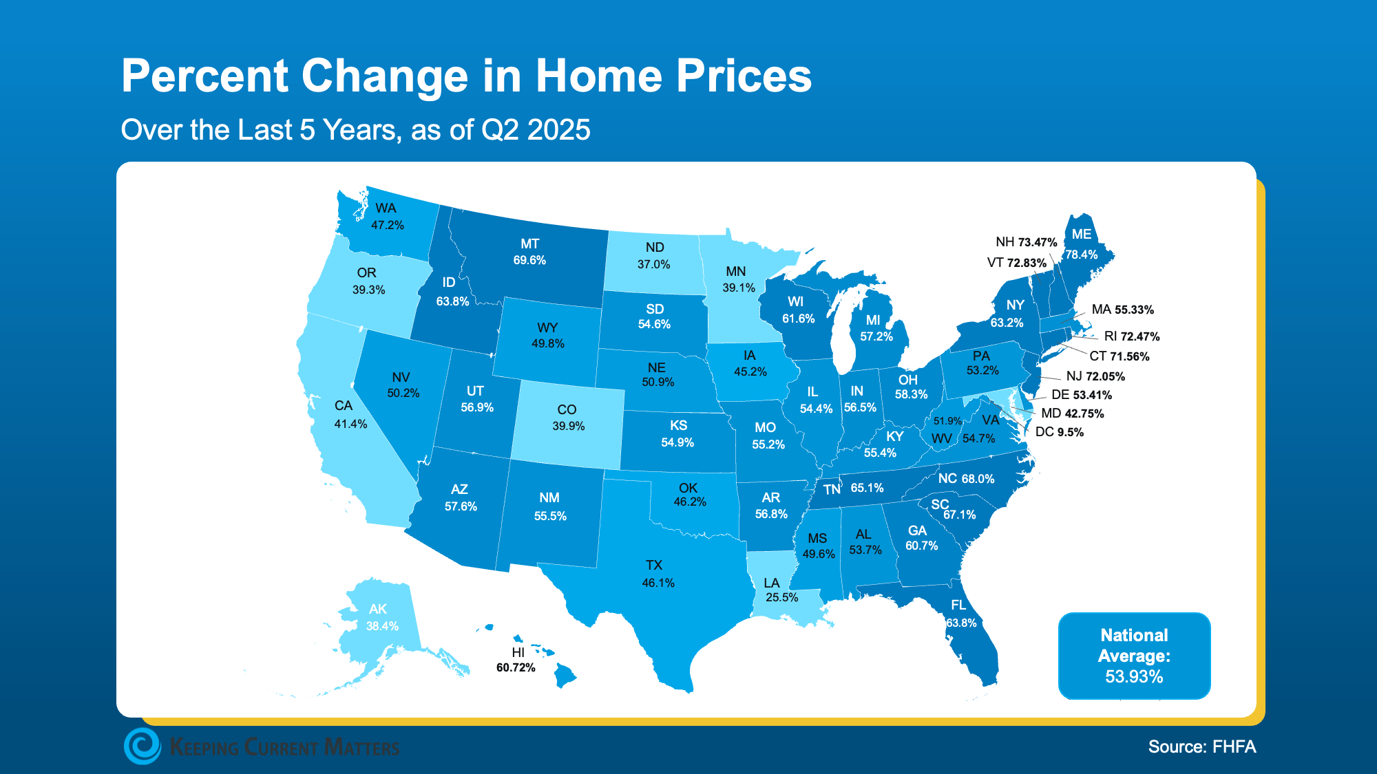 1. Significant Home Price Growth. According to the Federal Housing Finance Agency (FHFA), home prices have jumped by nearly 54% nationwide over the last five years (see map below):