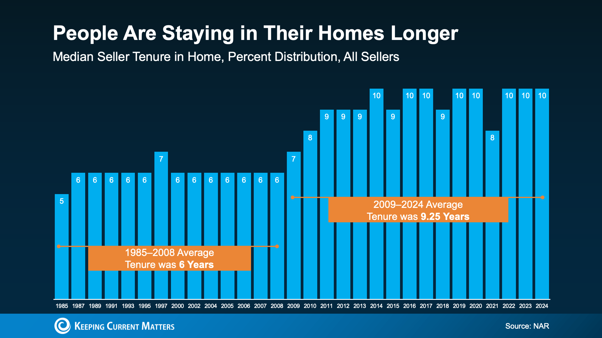 2. People Are Living in Their Homes Longer. Data from the National Association of Realtors (NAR), shows the average homeowner stays in their home for about 10 years now (see graph below):
