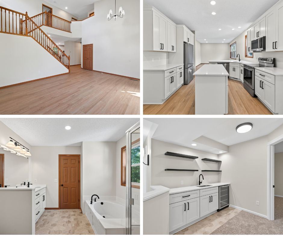 Nestled at the end of a peaceful cul-de-sac, this wonderfully remodeled two-story home offers the perfect blend of modern comfort and timeless style. Featuring 5 spacious bedrooms and 4 updated bathrooms, the home boasts dramatic vaulted ceilings and an abundance of natural light. Step inside to find brand new flooring and fresh paint throughout, along with thoughtfully designed built-in cabinets that provide both charm and functionality. The kitchen is complete with sleek quartz countertops, new stainless steel appliances, and new lighting. Perfect for entertaining, the finished walkout basement includes a custom built-in bar area, ideal for gatherings or relaxing nights in. Located just minutes from schools, parks, and shopping, this move-in-ready gem is a must-see for those seeking space, style, and location.