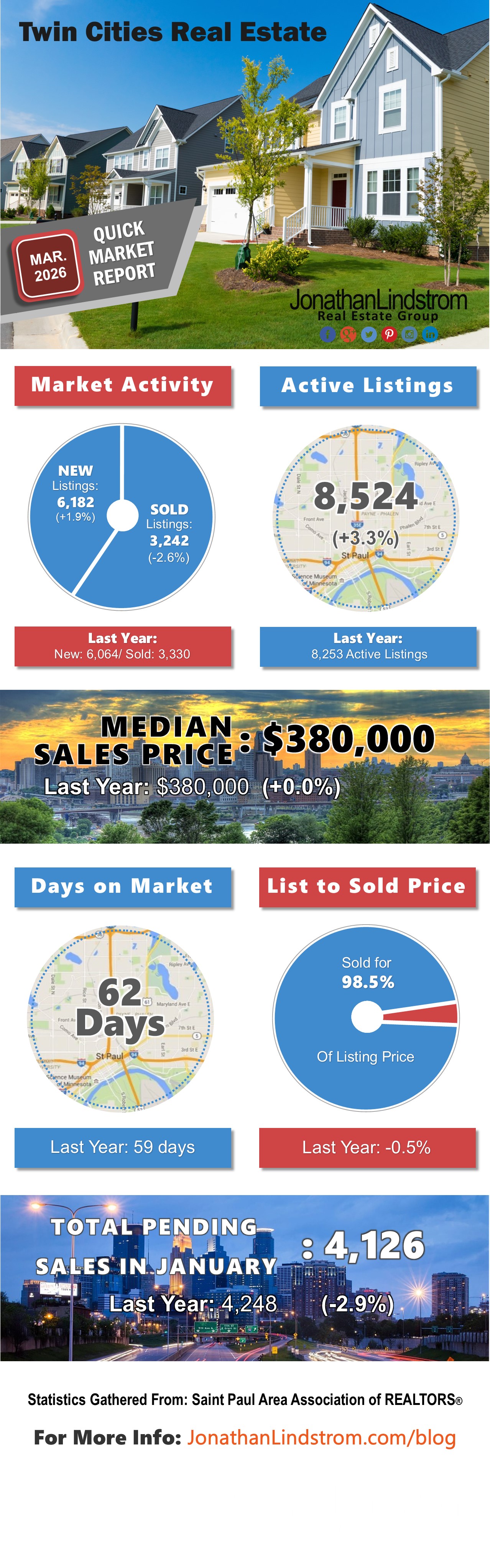 New Listings in the Twin Cities region increased 1.9 percent to 6,182. Pending Sales were down 2.9 percent to 4,126. Inventory levels rose 3.3 percent to 8,524 units.